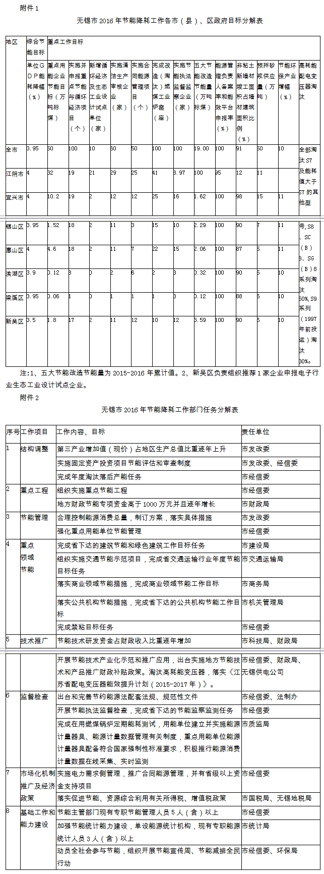附件:1.無錫市2016年節能降耗工作各市(縣)、區政府目標分解表