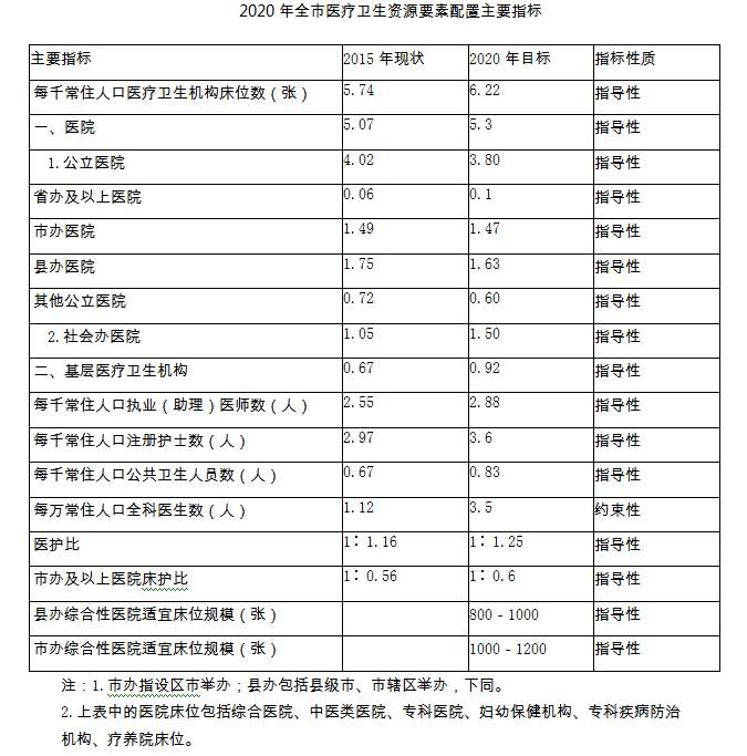 到 2020 年,全市每千常住人口醫(yī)療衛(wèi)生機(jī)構(gòu)床位數(shù)6.22 張以上,其中醫(yī)院5.3張,基層醫(yī)療衛(wèi)生機(jī)構(gòu)0.92張。中醫(yī)類醫(yī)院床位可以按照每千常住人口0.75張配置。同時,可以按照15%的公立醫(yī)院床位比例設(shè)置公立專科醫(yī)院,優(yōu)先支持兒童、精神、婦產(chǎn)、康復(fù)等專科發(fā)展。