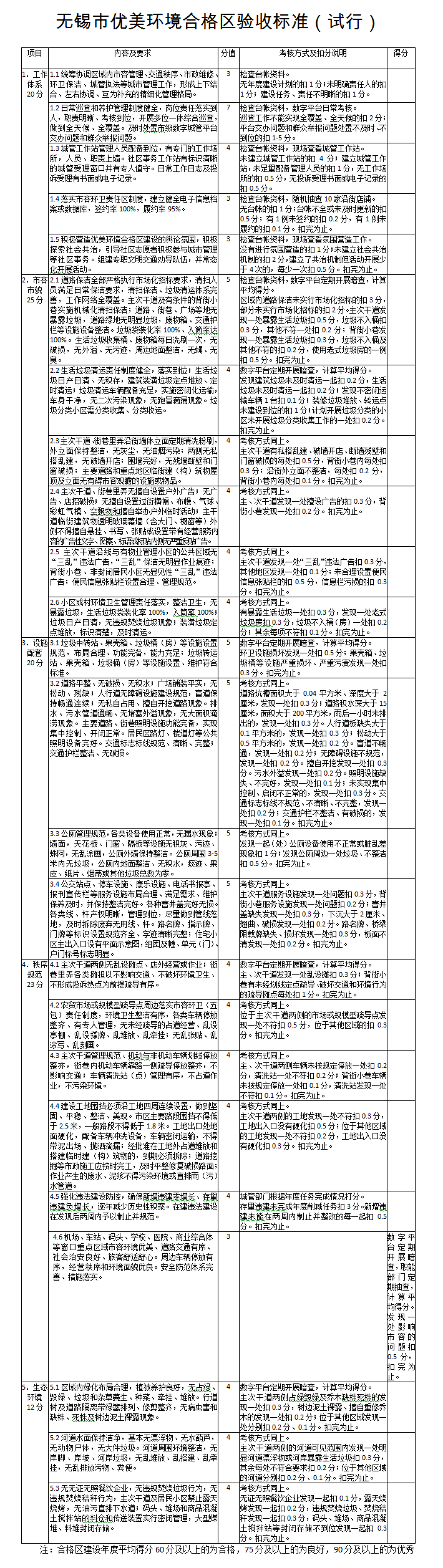 為加快開展優美環境合格區建設,全面提升城市精細化管理水平,將主城區和其他鎮(街道)集鎮區的各個管理單元全部建成管理規范、市容整潔、配套齊全、秩序井然、生態良好的優美環境合格區,特制定無錫市優美環境合格區建設標準(試行)如下。
