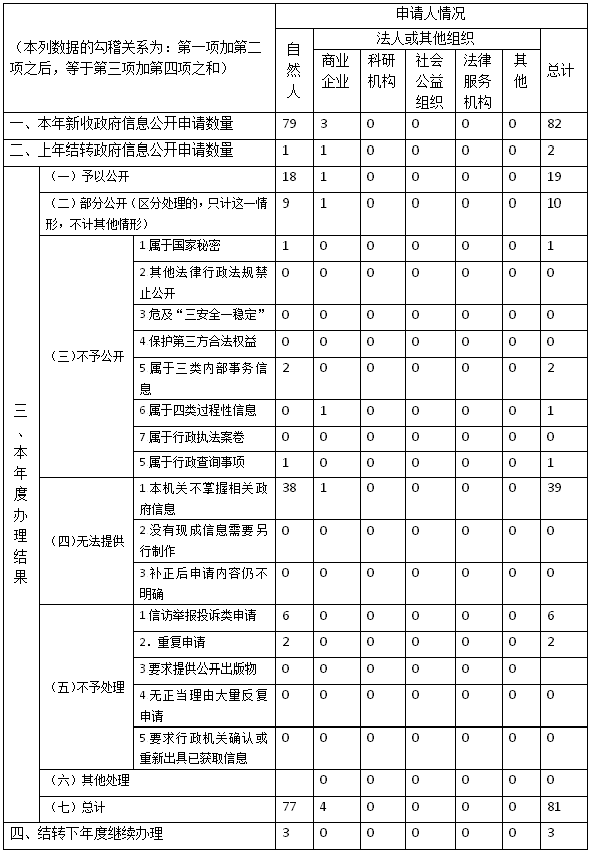 本年度報告是根據《中華人民共和國政府信息公開條例》(以下簡稱《條例》),由無錫市人民政府辦公室編制。全文包括(一)總體情況;(二)行政機關主動公開政府信息的情況;(三)行政機關收到和處理政府信息公開申請的情況;(四)因政府信息公開工作被申請行政復議、提起行政訴訟的情況;(五)政府信息公開工作存在的主要問題及改進情況。本年度報告中所列數據的統計期限自2019年1月1日起至12月31日止。本年度報告通過“中國無錫”政府門戶網站(網址為http://www.huchaba.com)予以公開。如對本年度報告有任何疑問,請與無錫市政府辦公室聯系,電話:0510-81820538,傳真:0510-81820401,郵箱:wuxi.zwgk@163.com,地址:無錫市新金匱路1號,郵政編碼:214131。