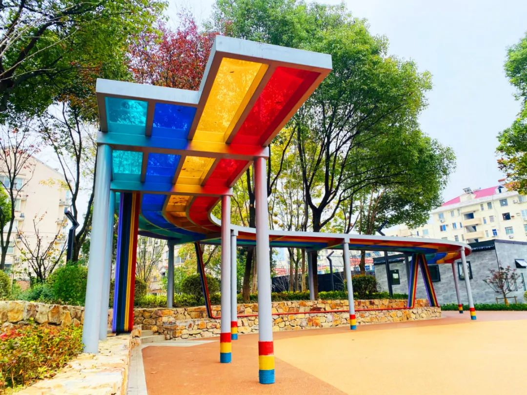 游園中心設置一組由七種顏色組成的鋼結構彩虹廊架,廊架長約20米,兼具休憩功能。