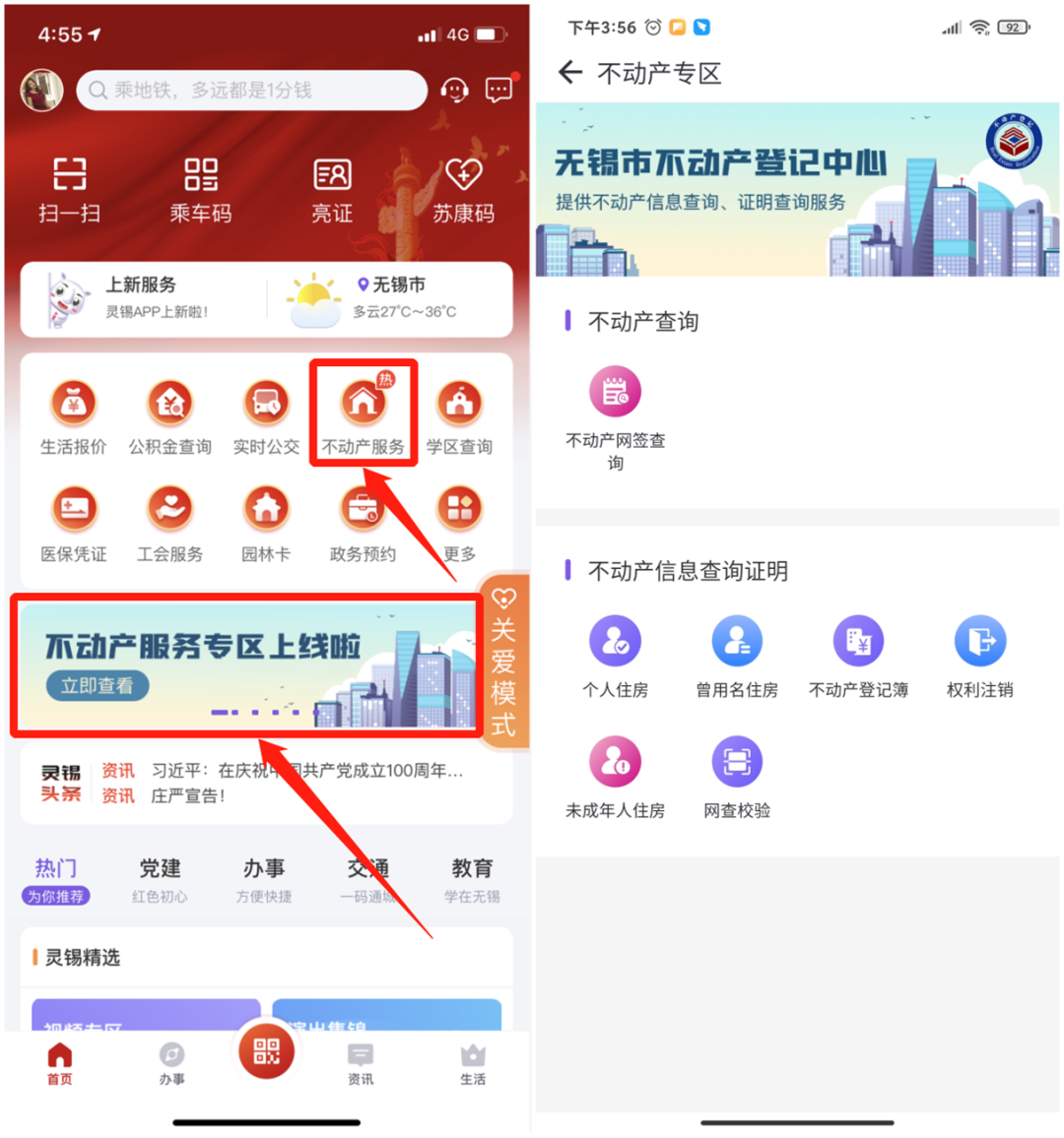 2、登錄“靈錫”APP,點擊APP首頁—【更多】—【專區(qū)服務】—【不動產專區(qū)】,或者點擊首頁不動產服務專區(qū)相關海報頁進入不動產在線查詢版塊;