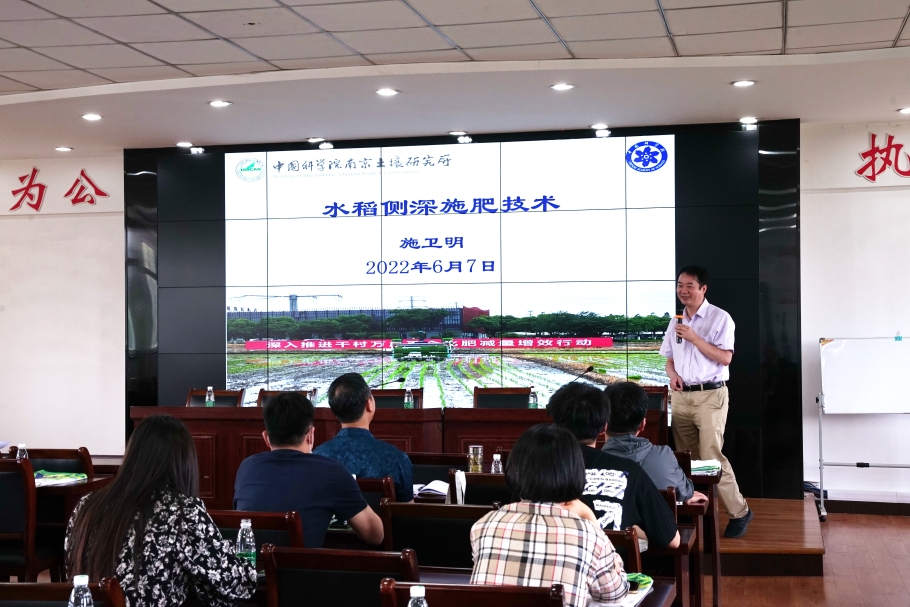 培訓(xùn)會上,江蘇省耕地質(zhì)量與農(nóng)業(yè)環(huán)境保護站殷廣德研究員、中國科學(xué)院南京土壤研究所施衛(wèi)明研究員兩位專家分別就測土配方施肥技術(shù)、水稻側(cè)深施肥技術(shù)進行了授課。