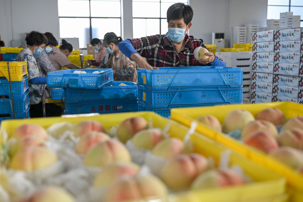 7月8日,工人在無錫太湖陽山水蜜桃科技有限公司內(nèi)分裝水蜜桃。