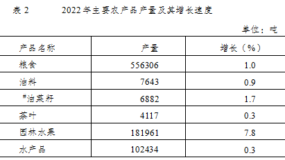 全年糧食總產量55.63萬噸,比上年增長1.0%。油料總產量7643噸,比上年增長0.9%,其中油菜籽6882噸,比上年增長1.7%。茶葉總產量4117噸,比上年增長0.3%。園林水果總產量18.20萬噸,比上年增長7.8%。