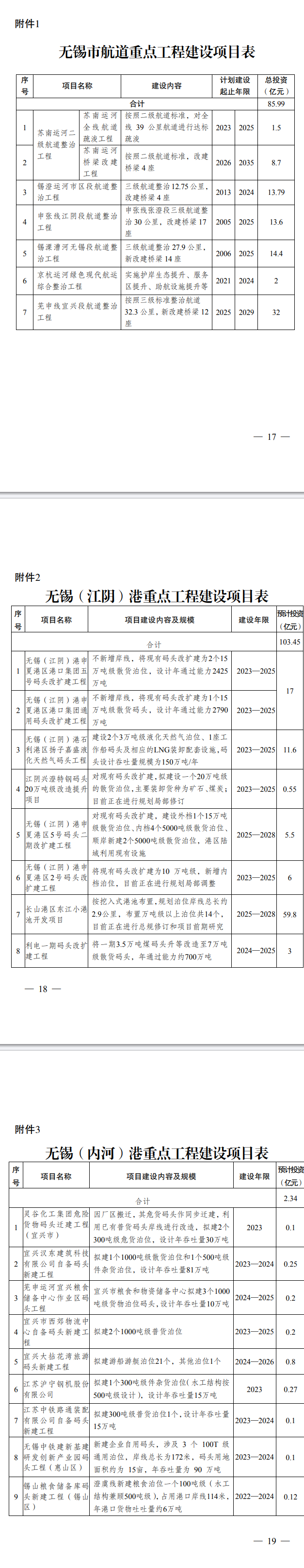 2.構建內暢外達干線航道網絡。落實“連斷點、暢干線、成網絡、通長江、達海港”總體要求,集中資源、聚力攻堅,扎實推進“六航齊治”,實施三級航道里程三年倍增計劃,加快打通干線航道堵點,開展局部淺段挖深、礙航橋梁改造提升,完成錫澄運河航道整治工程,打通申張線江陰段、錫溧漕河宜興段等三級航道建設難點,完成錫北線、錫澄運河、申張線、錫溧漕河4條干線竣工驗收,加快推進蕪申線宜興段航道整治工程等前期工作。到2025年,三級及以上干線航道達標里程達到約150公里,基本建成“二橫四縱”干線航道網絡。〔責任單位:市交通運輸局、市發展改革委、市自然資源規劃局、市生態環境局、市市政園林局、市水利局,相關市(縣)、區政府〕