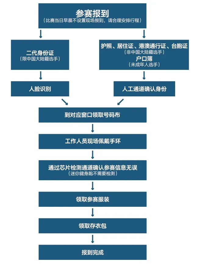 1. 參賽物品須選手本人領取,不得代領任何物品,報到現場將通過人臉識別技術對選手身份進行逐一核驗。請報到前務必攜帶本人有效身份證件原件,人、證不一致將無法領取參賽物品;
