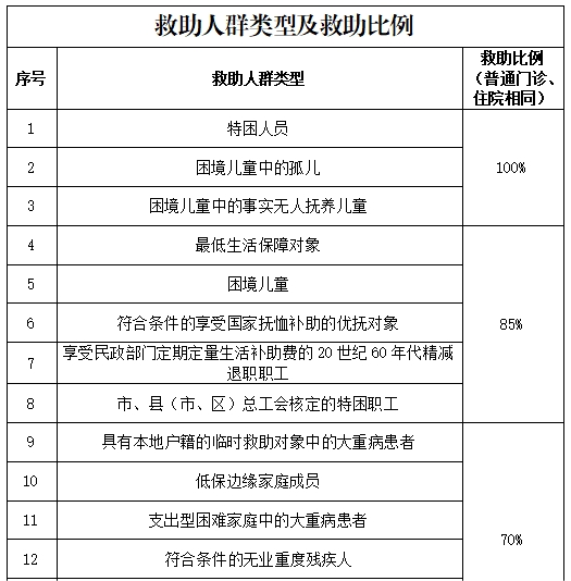 醫(yī)療救助對象根據(jù)認定的救助人群類型享受不同的救助比例,具體救助人群類型及救助比例見下表。