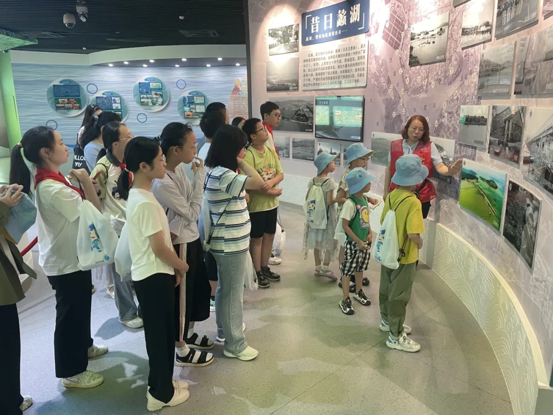 在蠡湖展示館,講解員以沙盤模型為引導,介紹了太湖與無錫獨特的地理關聯,直觀解釋了無錫作為太湖藍藻防控“主戰場”的原因,并借助展板將蠡湖綜合治理六大工程形象地展現在大家面前,讓同學們認識到水生態保護的重要性。