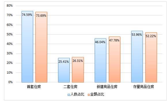 從貸款群體來看,剛需與改善型住房需求職工分別占貸款總人數的29.43%和62.85%。從單位性質來看,以城鎮私營企業及其他城鎮企業職工為主,貸款筆數和貸款金額占比分別為51.26%、48.34%。從購房面積來看,職工貸款購買90(不含)-120㎡房屋居多,占貸款總人數的36.33%。從主借人繳存基數來看,貸款主要以中、低收入職工為主,分別占貸款總人數的26.39%、72.09%。從貸款類型來看,純公積金貸款和組合貸款占比分別為59.88%、40.12%。從貸款結構來看,首套住房公積金貸款職工占貸款總人數的74.59%,二套住房公積金貸款人數占25.41%。具體放貸結構如下: