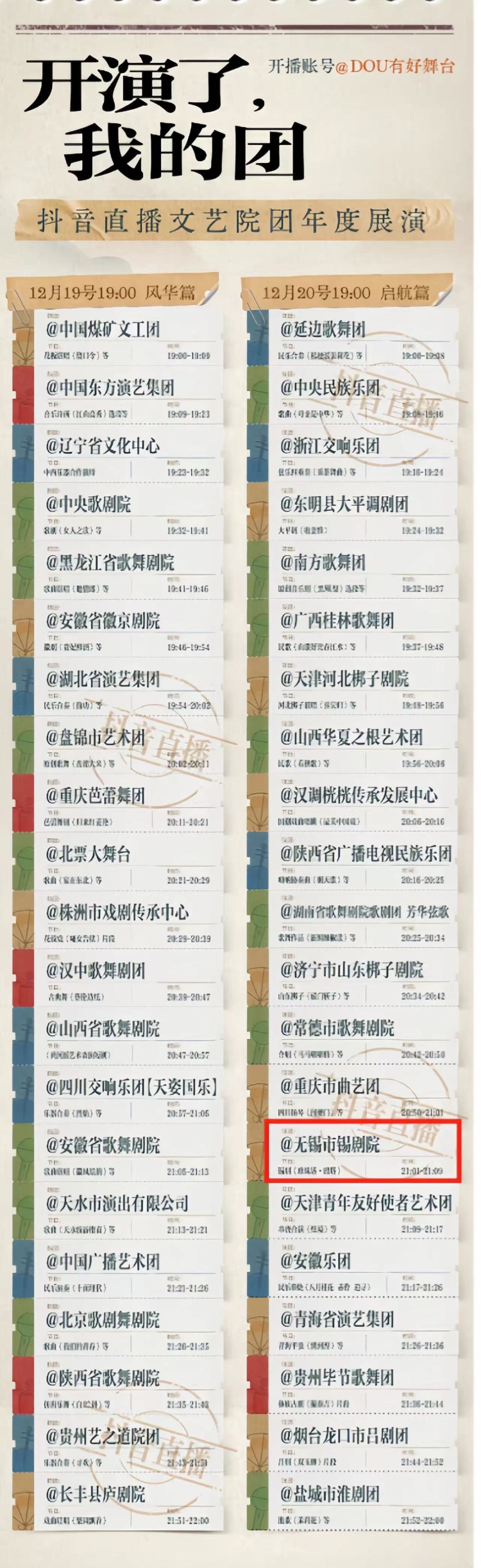 一次性集齊全國42家文藝院團演出的機會來了。12月19日、12月20日晚19:00,“開演了,我的團”抖音直播文藝院團年度展演活動,將在抖音直播間啟動。