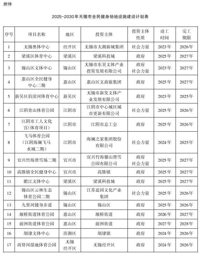 附件:2025-2030年無錫市全民健身場地設施建設計劃表