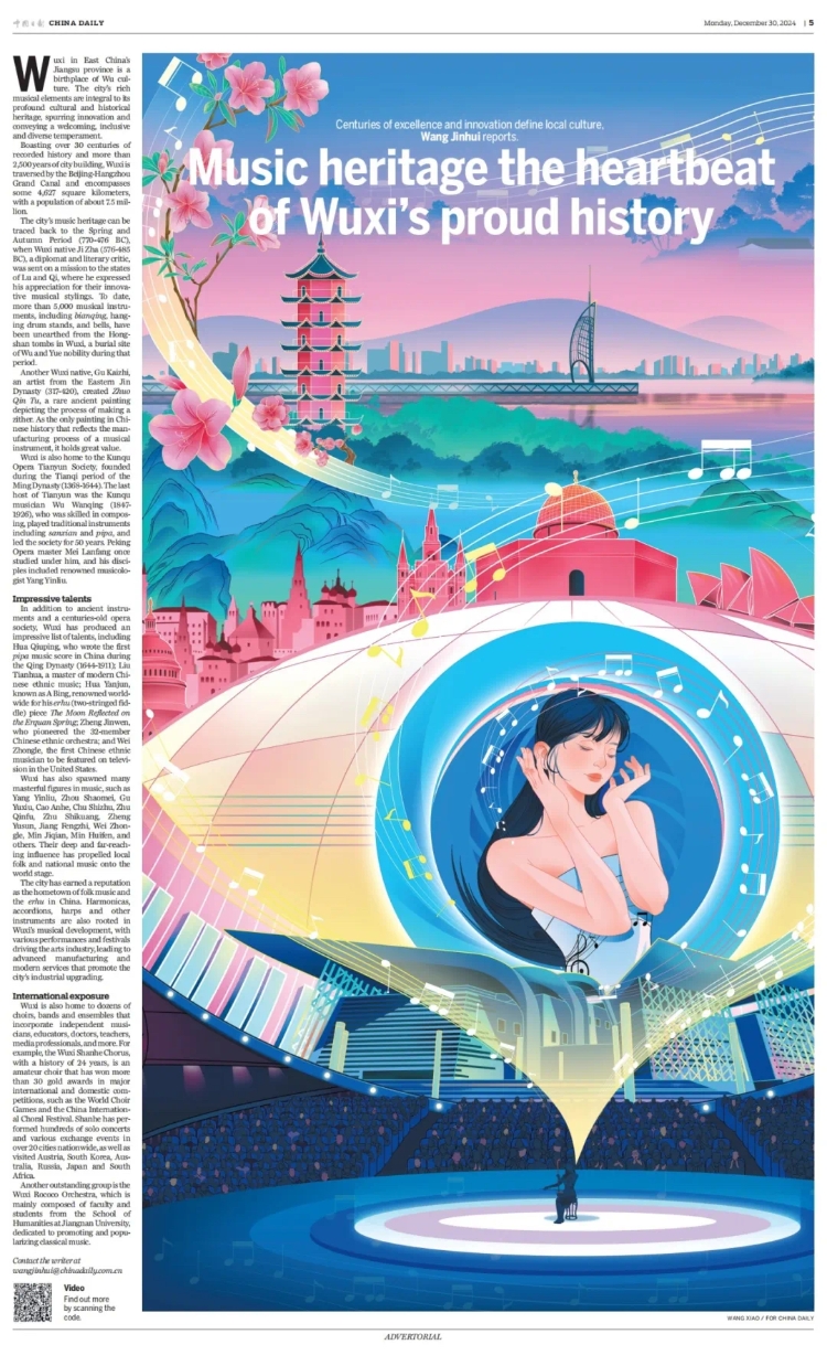 12月30日,《中國日報》刊發四聯版,以“千年音樂傳承,鑄就創新文化”為主題,借助原創手繪插畫等方式,從無錫燦若繁星的音樂名家、舉世聞名的樂器制造業、豐富多彩的民間音樂文化、頻繁多樣的中外文化交流等多角度,報道了無錫和音樂息息相關的故事。