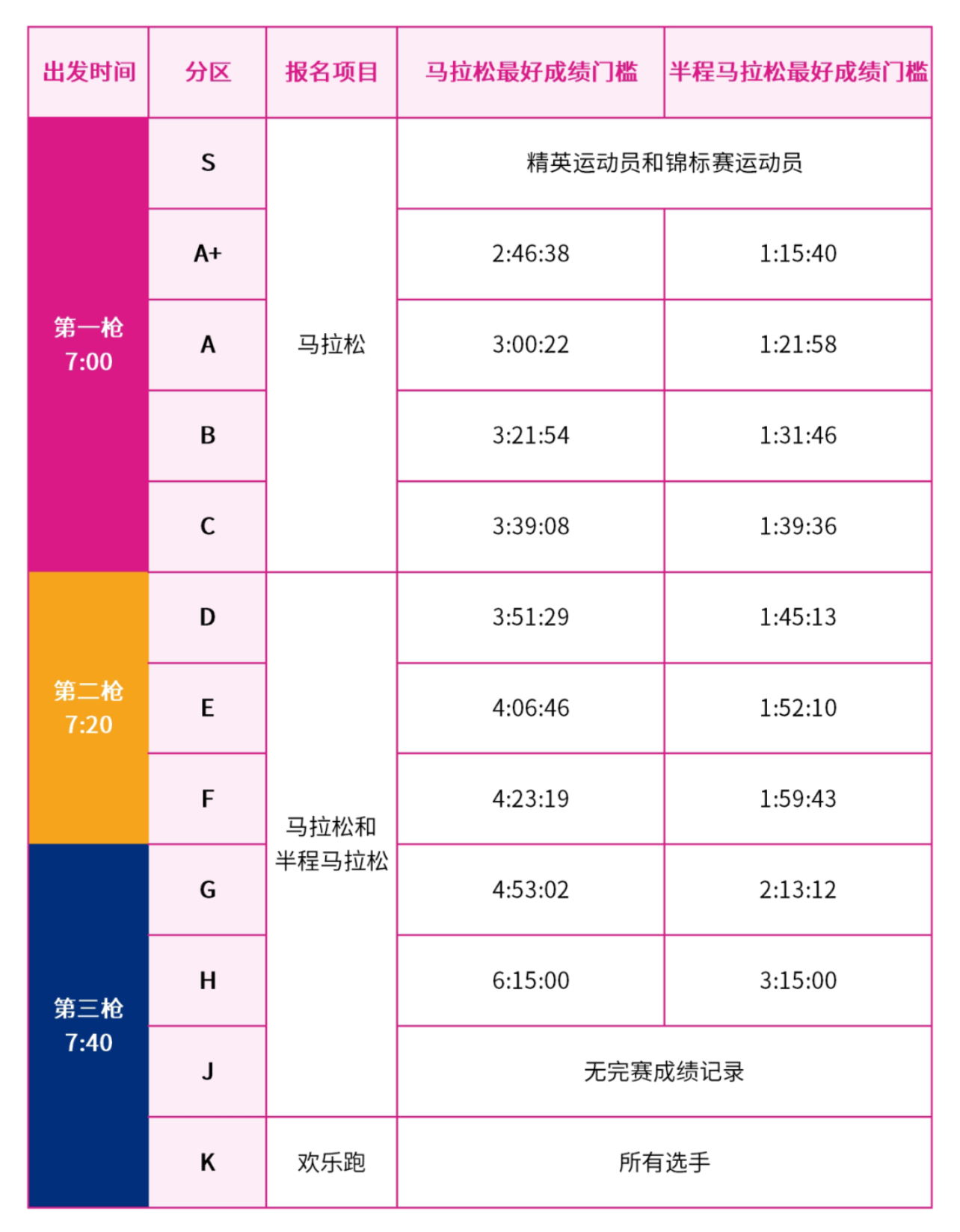 如果你符合該分區對應的報名項目且最好成績達到該分區對應的成績門檻(馬拉松或半程馬拉松中的任意一個)就會被編入相應分區與旗鼓相當的選手一同起跑!