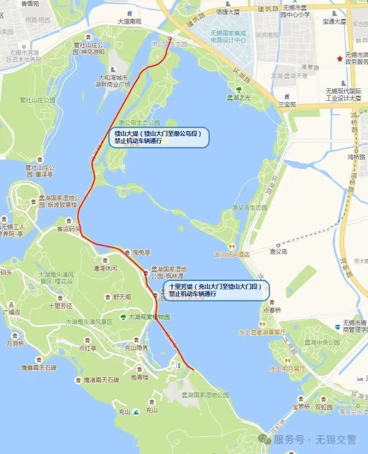 一、2025 年 3 月 8 日 7 時起至 4 月 6 日 20 時止,黿頭渚景區十里芳堤(充山大門至犢山大門段)、犢山大堤(犢山大門至渤公島段)實行臨時封閉,禁止機動車輛通行(公交車、接駁車和特種車輛除外)。