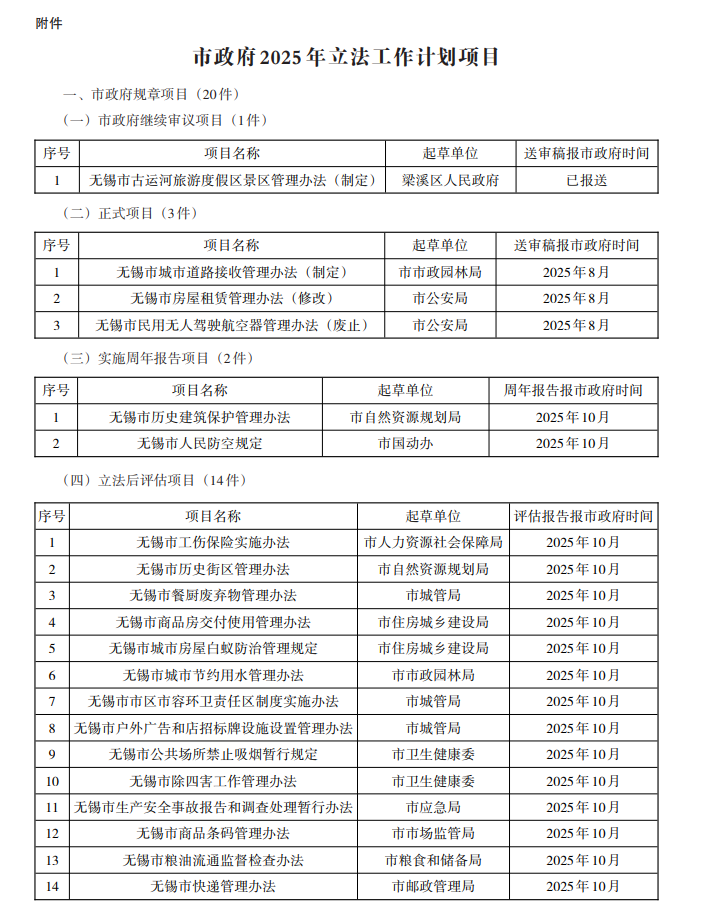市政府辦公室關于印發無錫市人民政府 2025 年立法工作計劃的通知