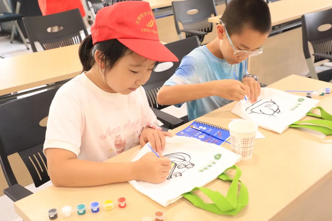 帆布包彩繪環節充滿歡聲笑語。孩子們為蛋糕、飯團等食物線稿填色,用繽紛色彩詮釋對健康飲食的理解,一幅幅童趣作品成為難忘的暑期記憶。