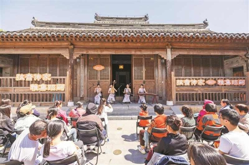 大墻門書場,是碩放街道的一個鮮明的文化符號。多年來,街道以書場為紐帶,守護(hù)文化根脈、傳遞民生溫度,讓文化在新時代煥發(fā)出別樣生機(jī)。今年春季,以古琴、民樂為載體,昭嗣堂開展了3場“香楠雅集”系列活動,古琴與古建筑交相輝映,成為推進(jìn)昭嗣堂“百宅百院”活化利用工程的生動實踐。夏日的夜晚,黃良起藝術(shù)館內(nèi)舉辦“古韻留痕”青少年拓片藝術(shù)體驗營,這場非遺研學(xué)活動開創(chuàng)了公共文化服務(wù)精準(zhǔn)觸達(dá)的新路徑。更值得一提的是街道全民美育素養(yǎng)項目——“綻放·碩藝學(xué)堂”全民藝術(shù)普及公益課程,目前已開設(shè)合唱、非洲鼓、爵士舞、竹笛、民族舞等13個門類15個班級,通過“點單式”服務(wù)將藝術(shù)送到家門口,有效提升了居民藝術(shù)素養(yǎng)。73歲的碩放居民黃佩君一口氣報了民族舞、非洲鼓、電子琴等好幾門課,“政府買單、百姓受益”的公益課程讓她直點贊。課程在普及藝術(shù)的同時,還孵化培育了一批社區(qū)特色文藝團(tuán)隊和文明實踐志愿服務(wù)隊伍。團(tuán)隊持續(xù)不斷“下沉”基層開展文藝匯演,惠及居民群眾上萬人次,有效激活了基層文化活力。