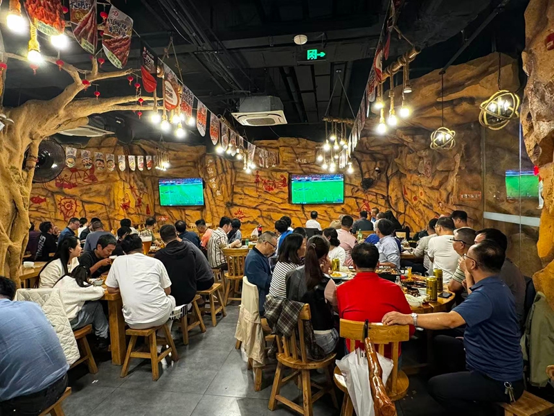 溪南公館大世界影城里也聚起不少觀賽的市民。李先生帶著孩子早早來到影廳中央位置,他們的臉上難掩期待:“我們家都喜歡足球,在電影院里看比賽,不僅有超大銀幕和震撼音效,還可以和球迷們交流,舒適度和氛圍感都很好。”觀賽活動(dòng)不僅讓市民過足癮,也為商家?guī)砹藢?shí)實(shí)在在的流量“紅利”。那天以后·重慶燒烤海鮮溪南公館店內(nèi)座無虛席,客人們吃烤串、喝啤酒、看球賽,一起為無錫隊(duì)干杯,喝彩聲和歡笑聲此起彼伏。“客流量、酒水銷售額均比沒有賽事的普通周日增長了50%。”店長徐培生認(rèn)為,“蘇超”這股熱勁把人氣實(shí)實(shí)在在帶到了線下。為讓廣大球迷更直觀感受“第二現(xiàn)場”氛圍,門店在大廳里裝了3塊直播大屏,在每個(gè)包廂里也都安排了電視直播,確保每個(gè)位置都能享受比賽。