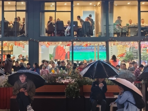 顯云街因“蘇超”半決賽而沸騰。夜幕降臨,一塊塊各具特色的招牌漸次亮起;亭臺(tái)中央,檐角下的直播大屏實(shí)時(shí)傳遞著“蘇超”賽場上的激情。盡管細(xì)雨不停,但大屏對(duì)面的外擺區(qū)域仍然坐滿了顧客。比賽進(jìn)入膠著時(shí)刻,整條街便化作了露天劇場,球迷的心臟隨著攻防轉(zhuǎn)換共同跳動(dòng),不少躲雨的行人也加入助威行列。“店內(nèi)店外都坐滿了人,相較于以往的雨夜,客流增長了超50%。”大屏正對(duì)面的天府龍蝦烤全羊店內(nèi)同樣播放起了“蘇超”賽事,老板娘薛尤介紹,兩塊直播大屏對(duì)門店客流帶動(dòng)效果明顯,有無錫隊(duì)比賽的夜晚場場爆滿。