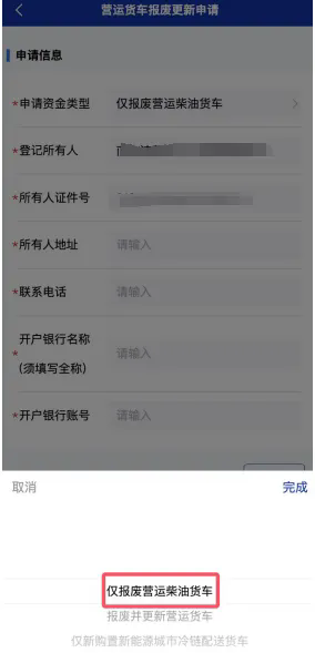 2.請根據自身情況選擇“僅報廢老舊營運貨車、報廢并更新營運貨車、僅新購新能源城市冷鏈配送貨車”三種類型之一進行申報,提交后不得更改。 3.非營運車輛和輕型貨車(除新能源城市冷鏈配送貨車外)不在本次補貼之列。