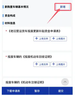 4.下載《老舊營運貨車報廢更新資金申請表》,打印并簽字蓋章后上傳到申請材料中。