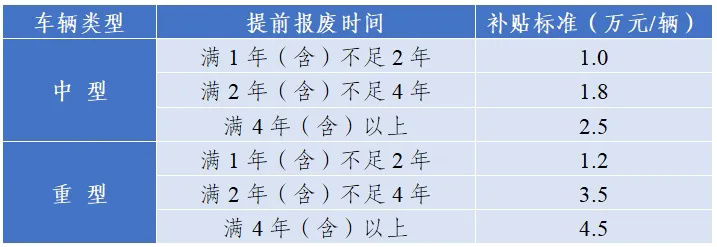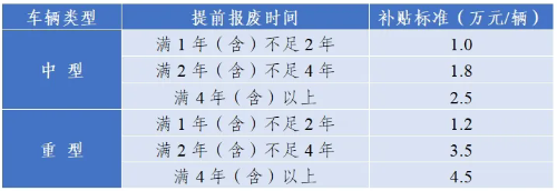 3.對距離強制報廢年限不滿一年的國四及以下排放標準營運貨車實施報廢,并新購中重型國六排放標準貨車或新能源貨車的,按照新購補貼標準予以補貼;對掛車不予補貼。