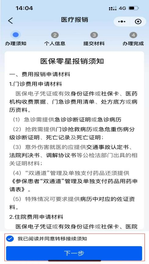 登錄個(gè)人賬戶后,點(diǎn)擊“更多”在“我要辦”模塊選擇“醫(yī)療報(bào)銷”,進(jìn)入報(bào)銷界面,勾選報(bào)銷須知后點(diǎn)擊“下一步”。