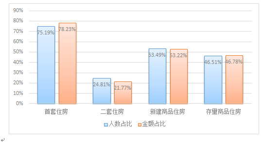 從貸款群體來看,剛需與改善型住房需求職工分別占貸款總?cè)藬?shù)的26.3%和66.75%。從單位性質(zhì)來看,以城鎮(zhèn)私營企業(yè)及其他城鎮(zhèn)企業(yè)職工為主,貸款筆數(shù)和貸款金額占比分別為60.01%、58.33%。從購房面積來看,職工貸款購買90(不含)-120㎡房屋居多,占貸款總?cè)藬?shù)的40.44%。從主借人繳存基數(shù)來看,貸款主要以中、低收入職工為主,分別占貸款總?cè)藬?shù)的25.81%、72.76%。從貸款類型來看,純公積金貸款和組合貸款占比分別為37.08%、62.92%。從貸款結(jié)構(gòu)來看,首套住房公積金貸款職工占貸款總?cè)藬?shù)的75.19%,二套住房公積金貸款人數(shù)占24.81%。具體放貸結(jié)構(gòu)如下: